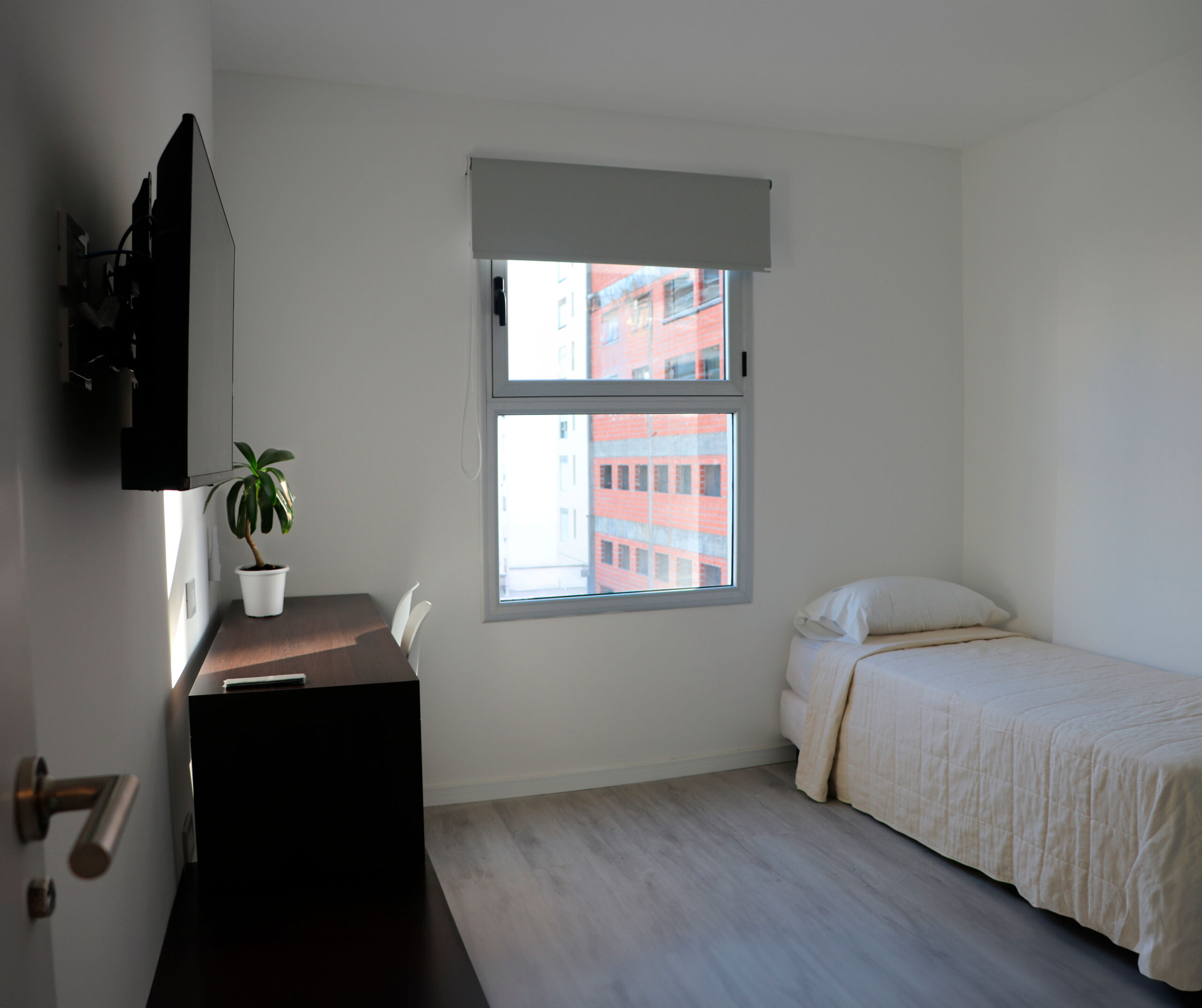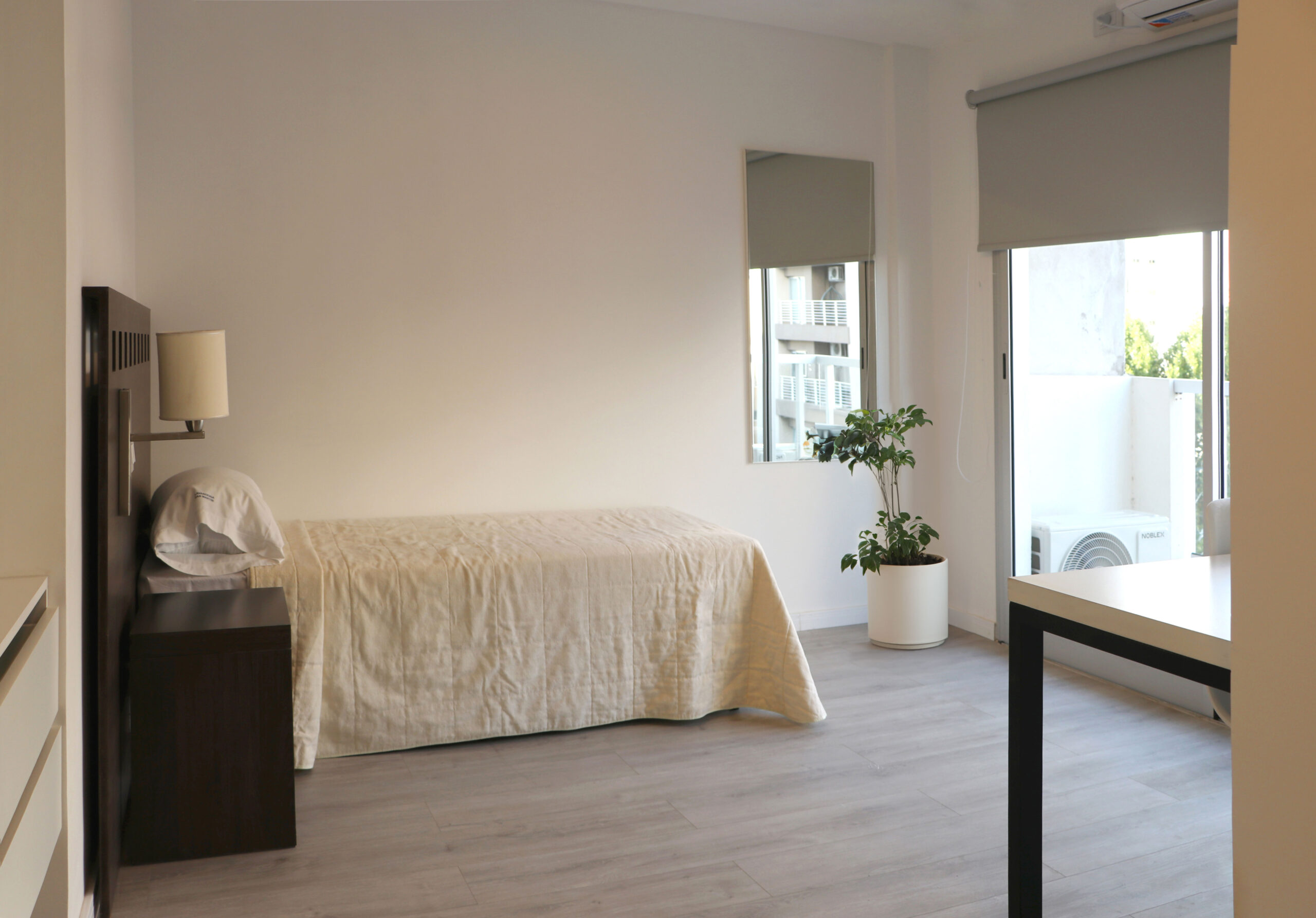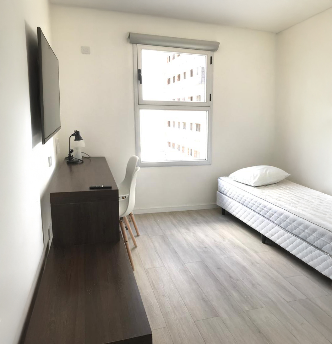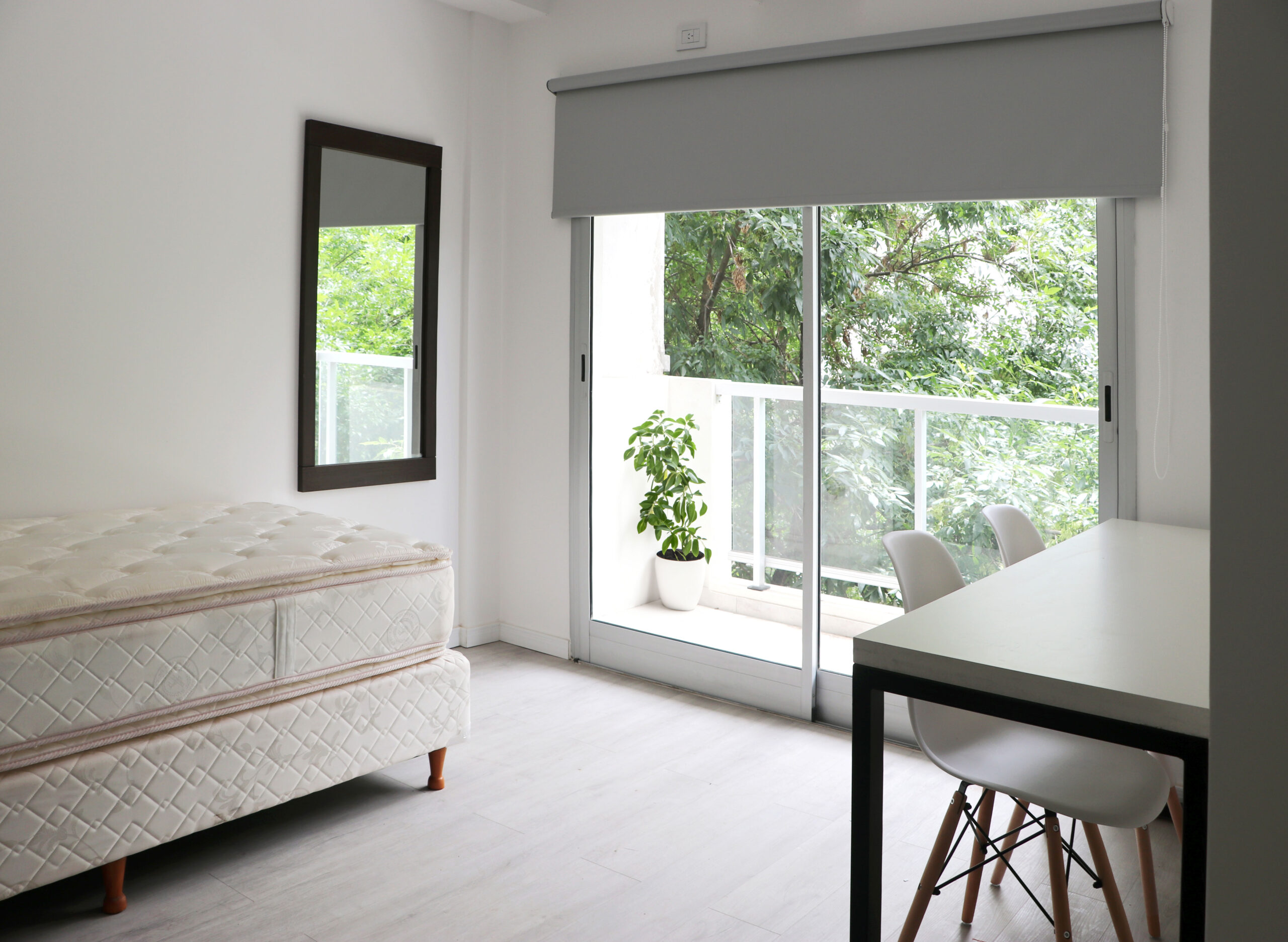 Cuenta con una habitación-estudio, kitchenette integrada, baño completo y un amplio balcón. La habitación-estudio; incluye 1 sommier de 1