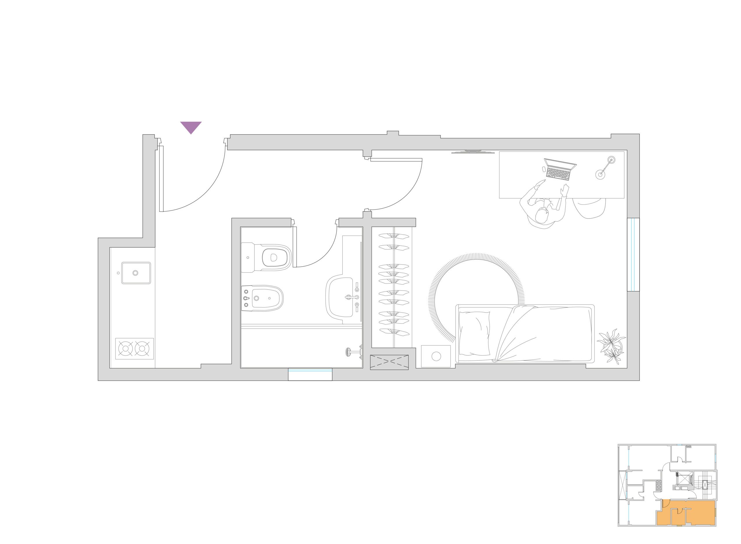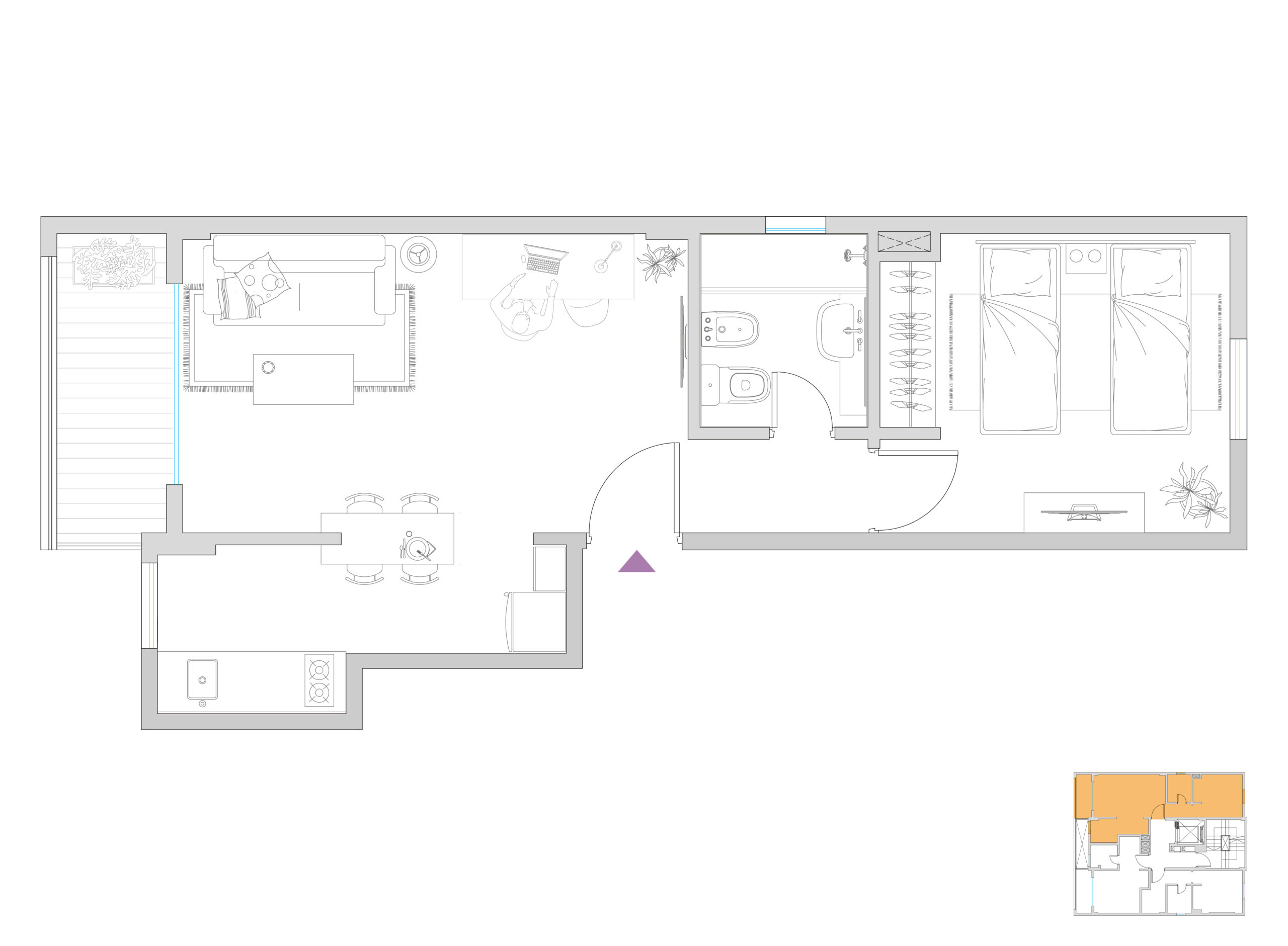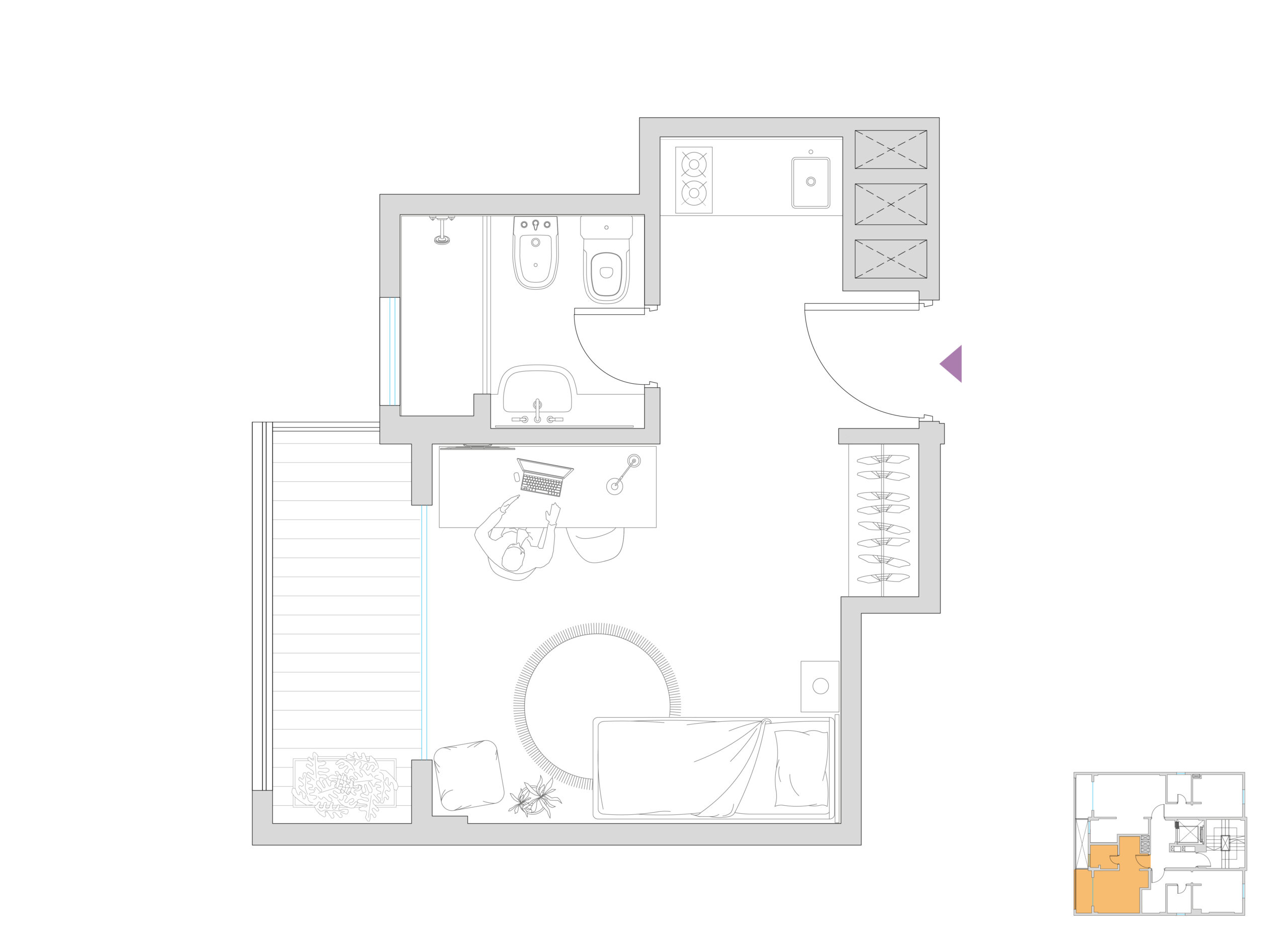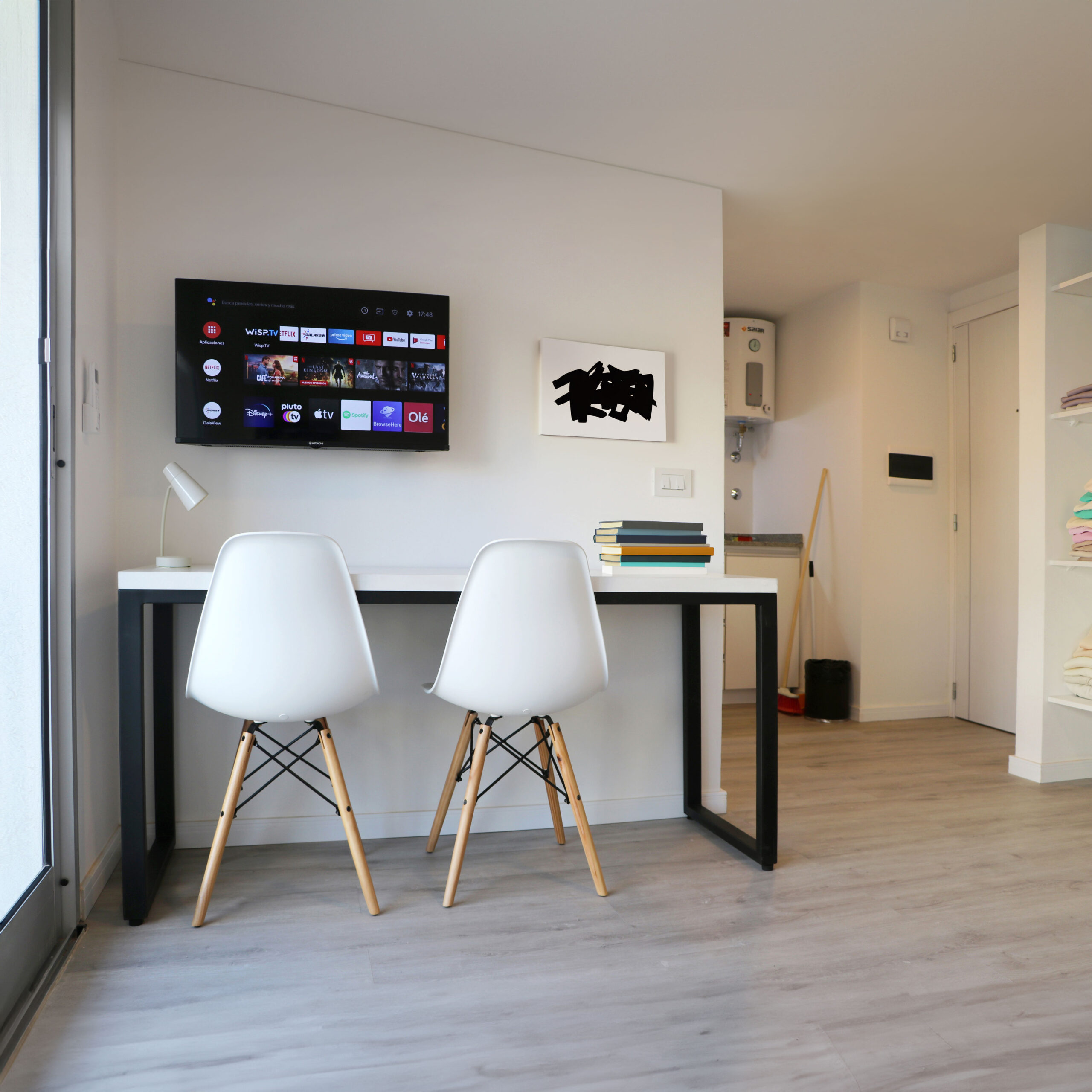 Cuenta con una habitación-estudio, kitchenette integrada, baño completo y un amplio balcón. La habitación-estudio; incluye 1 sommier de 1