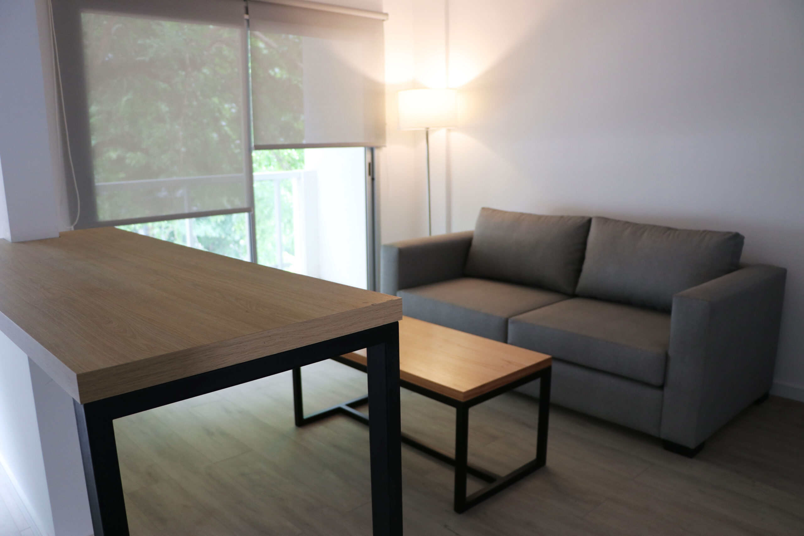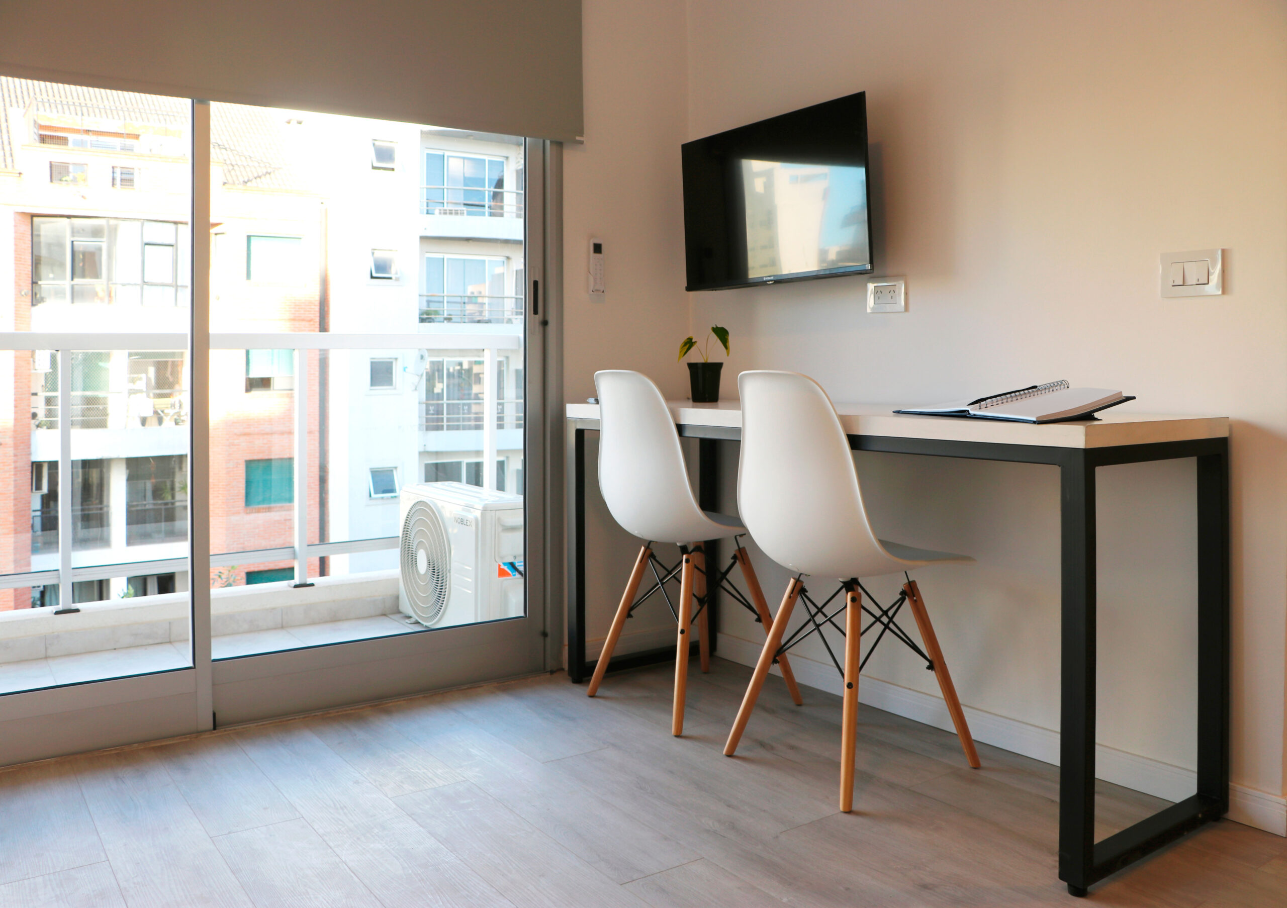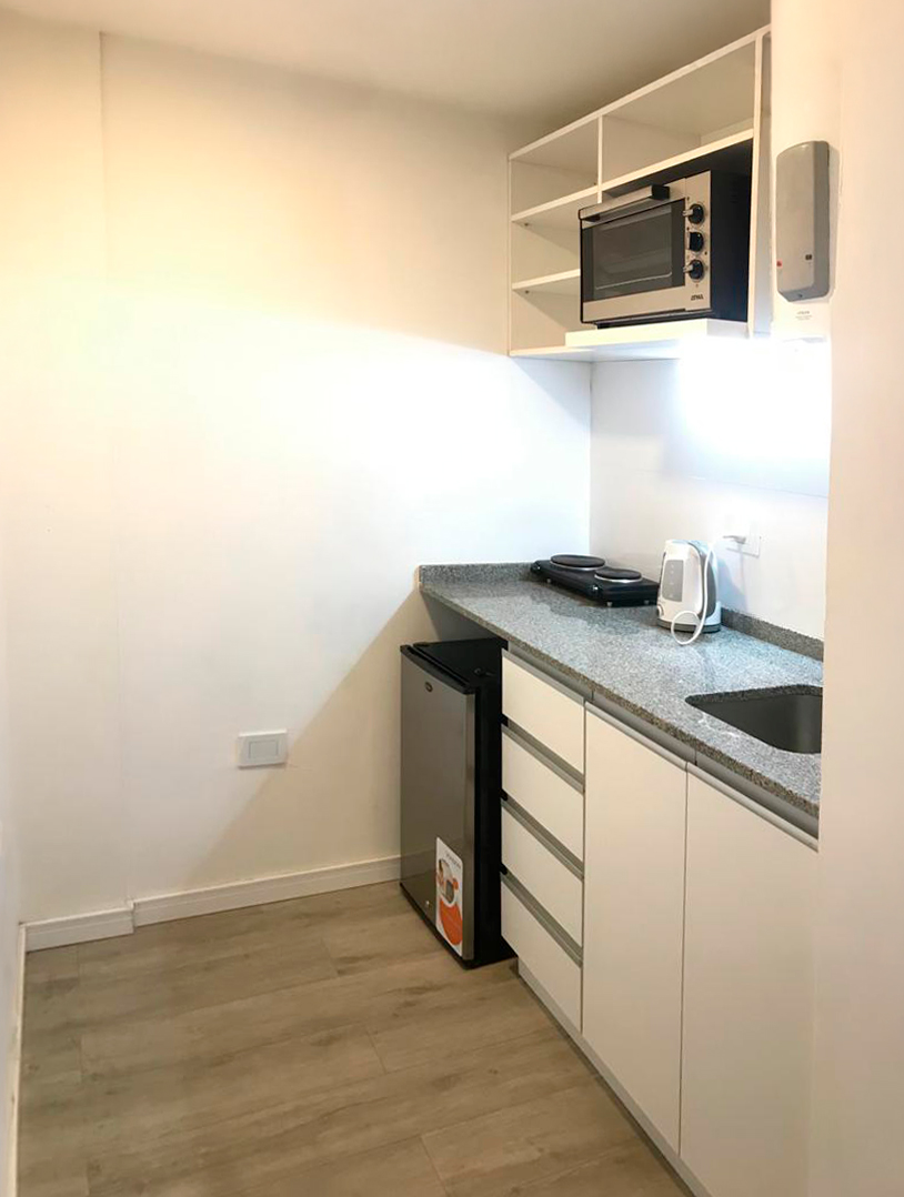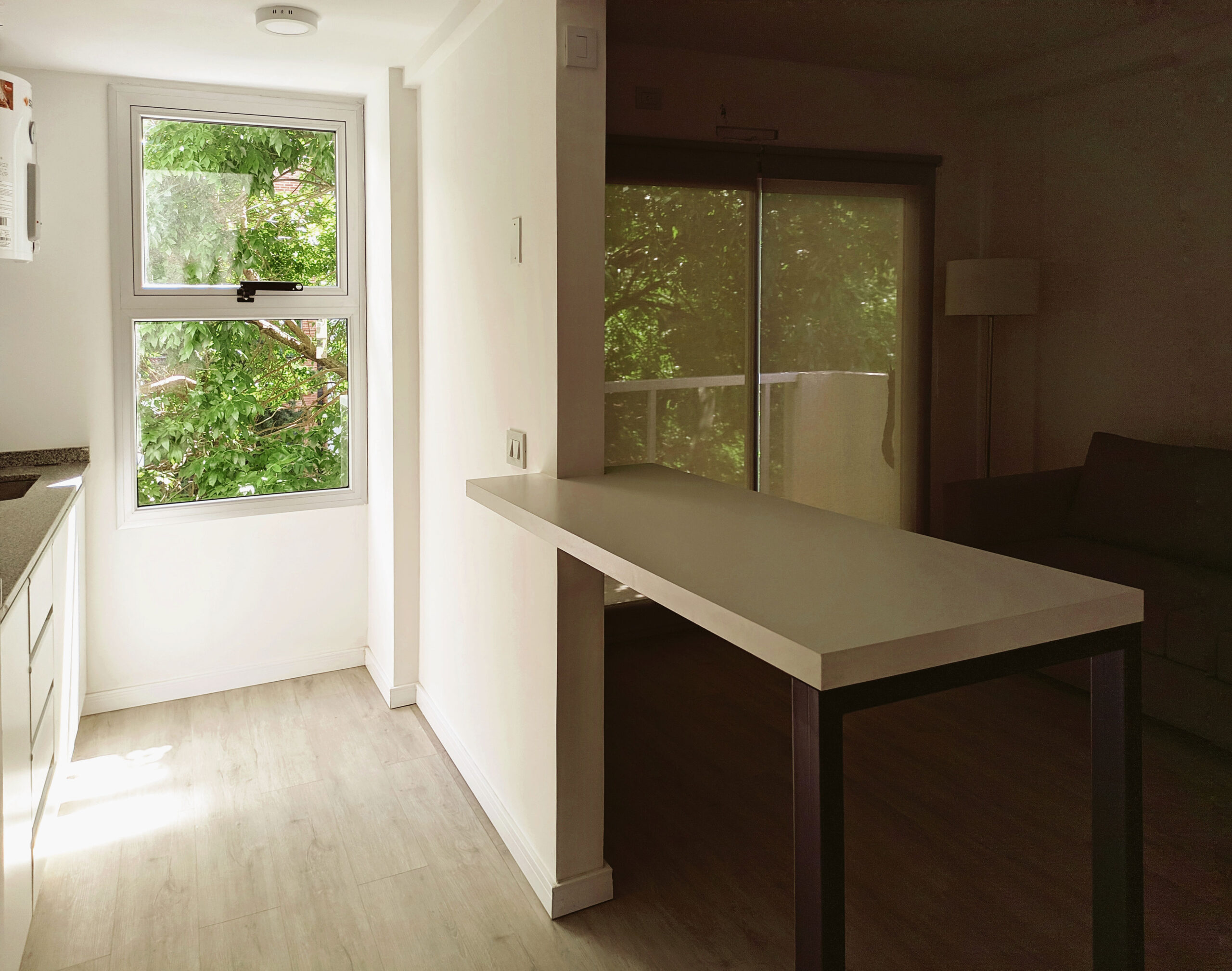 Cuenta con un amplio living/sala de estar, espacio de estudio/trabajo con balcon a contrafrente; cocina y baño completos. Habitación